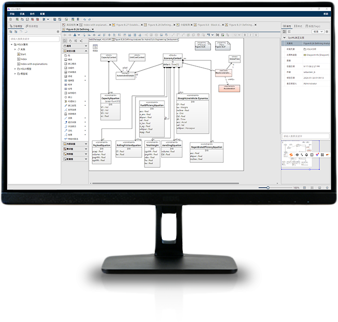支持SysML v1.6标准,用户可通过SysML元模型及9种视图、表格、矩阵、关系图等不同方式对系统需求、功能、行为、架构、接口、参数等元素进行建模和展示。支持用户完成从元素创建到基础视图呈现的全流程操作,借助 SysML 定义的多种图表(如需求图、用例图、活动图、序列图、状态机图、块定义图、内部块图等),可支持对复杂系统进行多维度、结构化的建模。可描述系统的需求、功能、结构、行为及各元素间的关系,从整体到局部、从抽象到具体地展现系统全貌;支持生成PNG等基础格式图片文件,实现本地保存;同时内置基础语法校验功能,对无效元素命名、违规关系配置等问题进行提示,确保模型符合SysML基础规范。