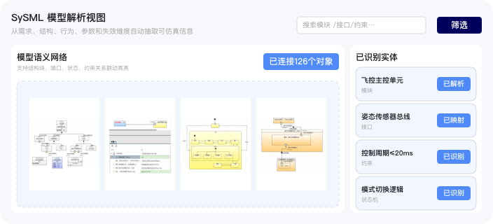 解析用户自然语言需求,自动生成结构化SysML需求元素,并识别模糊、冲突或遗漏项。调用需求-模型一致性检查、可追溯性分析等工具;触发基于需求的仿真用例生成。