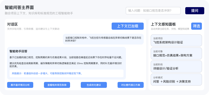 智能助手作为随时待命的百科全书,为用户提供概念解析、方法论指导和标准查询等服务;辅助分析架构权衡、接口规范、仿真结果等,基于上下文主动推送风险预警和优化建议。